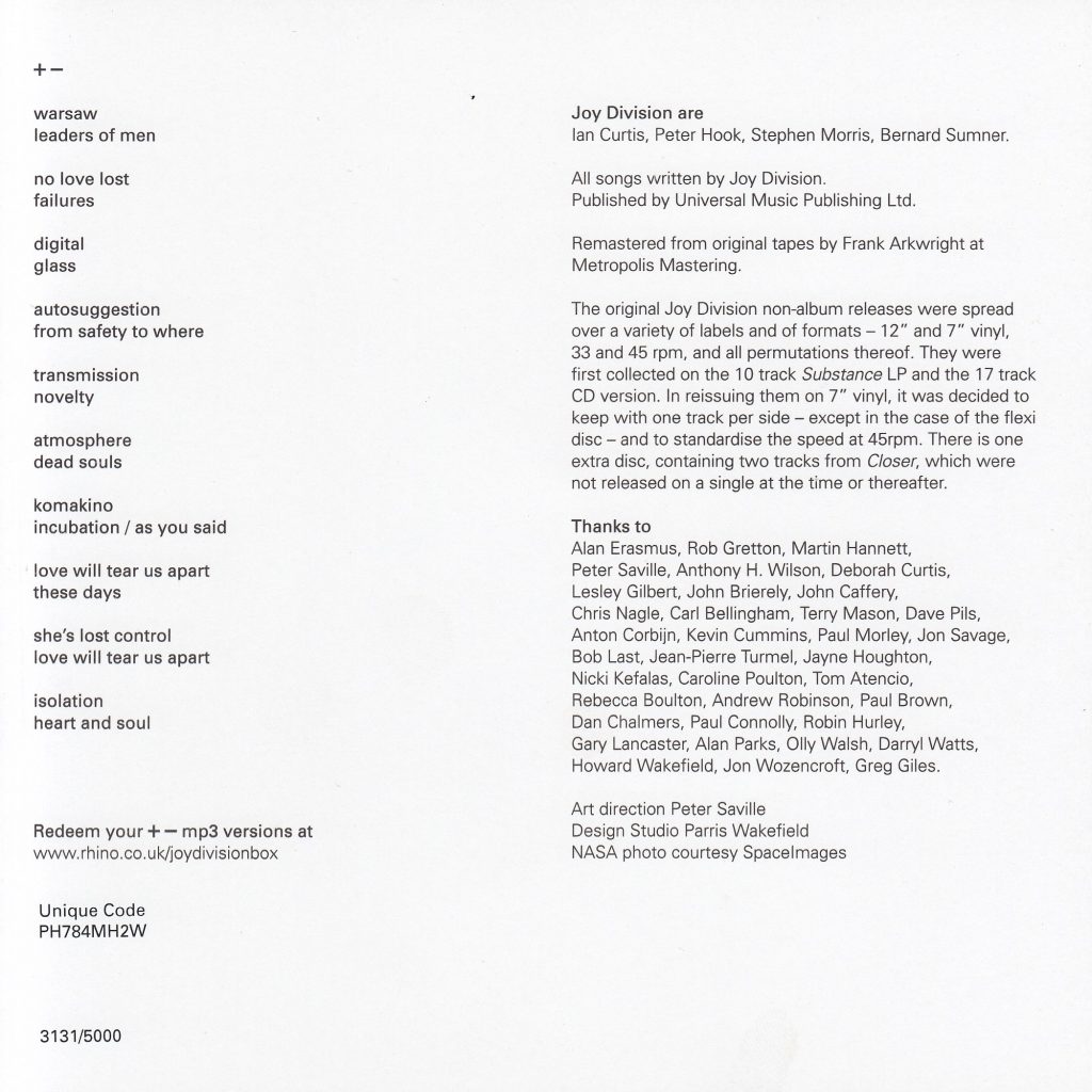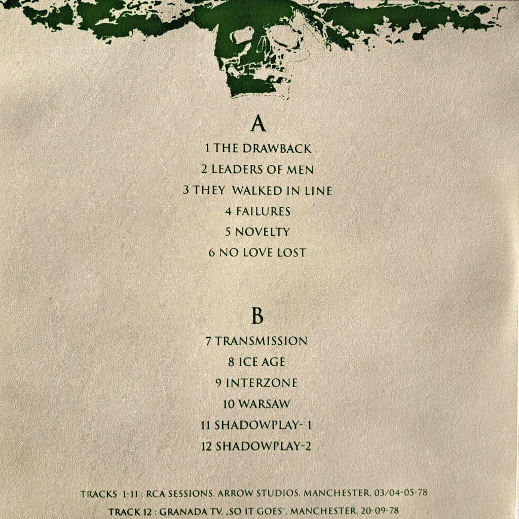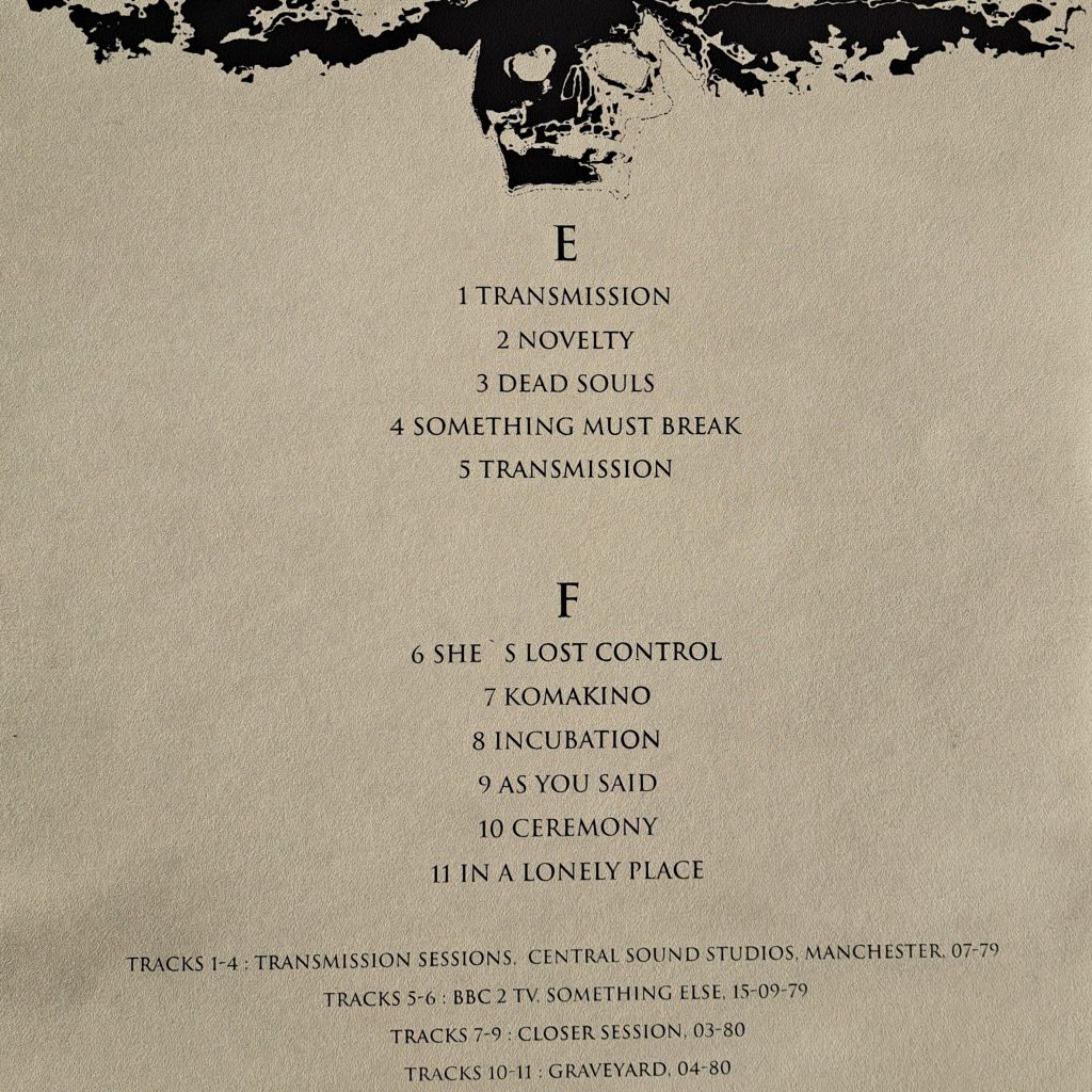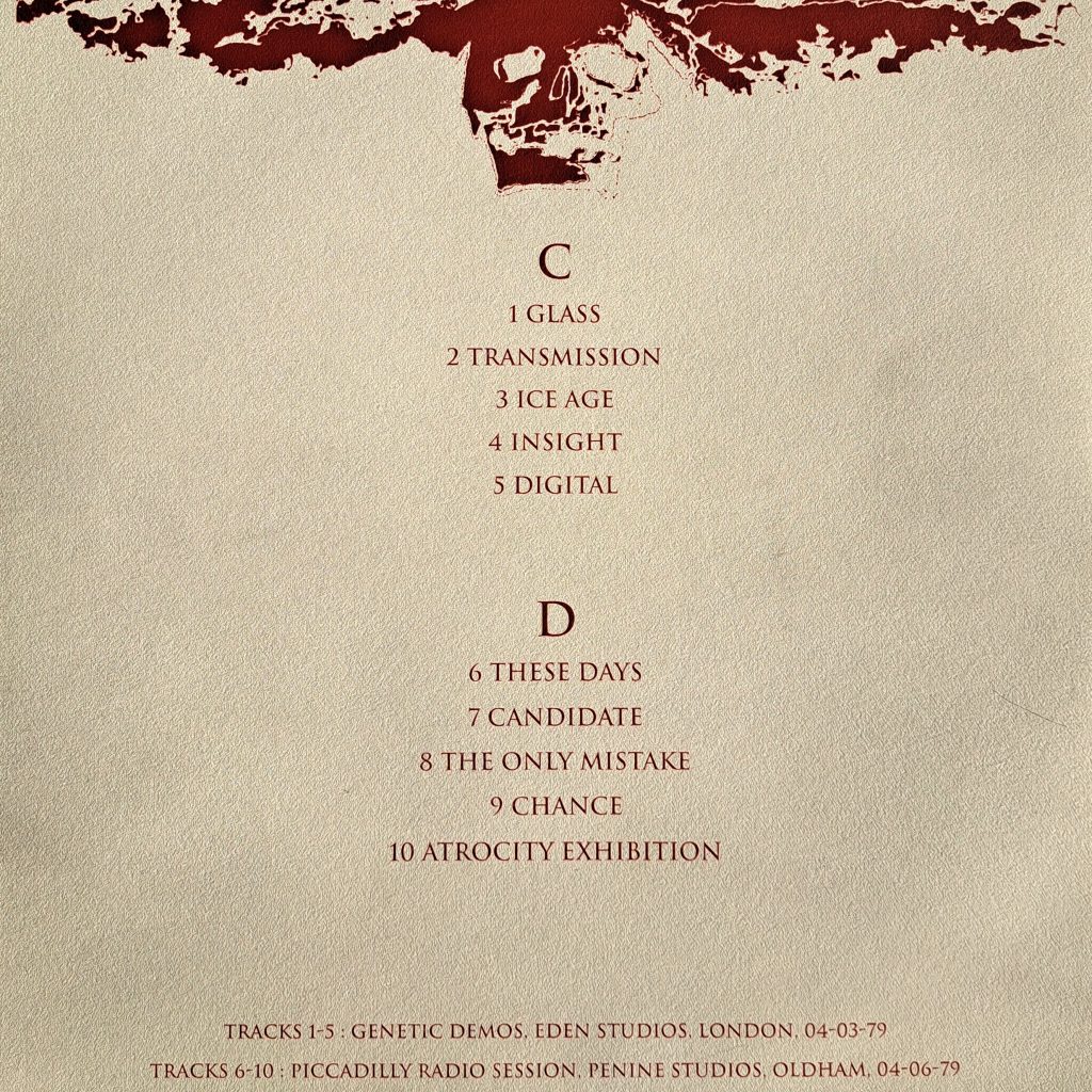 Even today, after almost 45 years,Still remains an inconsistent listening experience for me. The A and B sides bring together studio recordings that are largely reminiscent of their rawer, punkier origins from 1977 and 1978. Exercise One and three other tracks (The Only Mistake, Walked In Line, The Kill) are remnants of older material from the Unknown Pleasures sessions, reworked in 1981. These tracks apparently didn’t fit well with the more futuristic sound of the Unknown Pleasures album. Ice Age was a commissioned work for Factory Records and was supposed to appear on the Futurama Sci-Fi Festival sampler, which ultimately never materialised. Glass comes from the Factory Sampler double single from 1978. Only Dead Souls, the B-side of the Sordide Sentimental 7″ single, and Sound Of Music, a track from the LWTUA session, present a more contemporary sound from the post-Unknown Pleasures era.