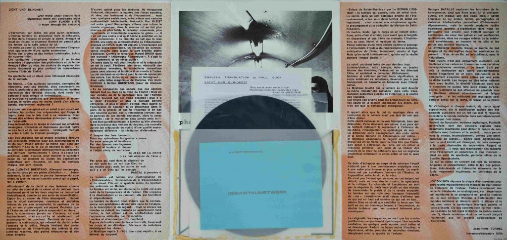 Substance was first released in 1988 as a single LP, and in 2015 a 2LP album with 9 additional songs was finally released. It features carefully curated tracks that appeared on various compilations with other artists, such as Autosuggestion, From Safety To Where and Digital, as well as previously unreleased singles such as Dead Souls from the Sordide Sentimental single and Incubation from the flexi disc. Dead Souls is a dark, dystopian piece of music with truly haunting lyrics. The vocals only kick in halfway through the song, delivered with great effect by Ian Curtis. The poetic darkness of the lyrics is reminiscent of stories told by Edgar Allan Poe or H.P. Lovecraft. I wonder why this particularly impressive piece was not released on the Closer LP, where it would certainly have fit perfectly, but was instead passed on to the small French label Sordide Sentimental. Anyway, Sordide Sentimental created an impressive GESAMTKUNSTWERK with the Licht & Blindheit 7″ single, which is highly prized and sought after in collector circles.